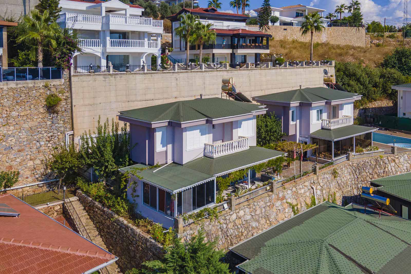 Комплекс состоит из четырёх отдельно стоящих вилл с общей ухоженной территорией, бассейном, садом и уютной беседкой. Тихое и уединённое место, при этом до моря и центра Алании всего 3 км.