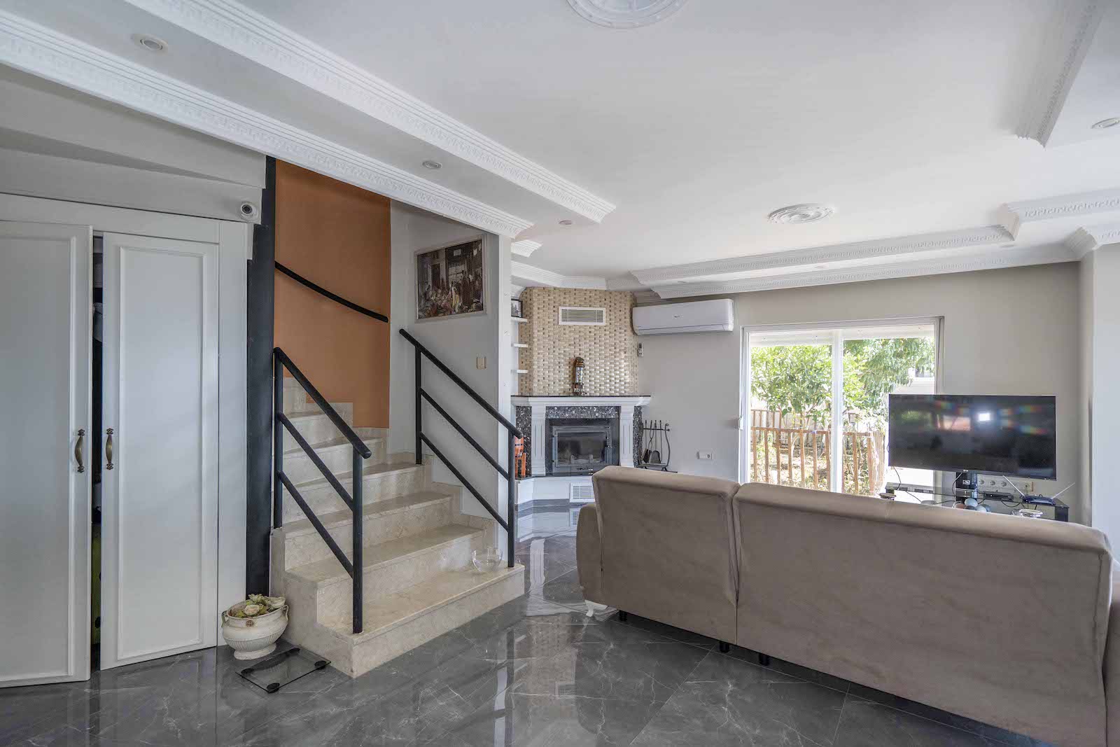 Нетто площадь виллы — 150 м², брутто — 135 м². Планировка: гостиная с камином и кухней американского плана, 3 спальни, 3 санузла, балкон и кладовая. Из гостиной есть выход на просторную затенённую террасу — идеальное место для летних завтраков или вечерних ужинов с видом на город.