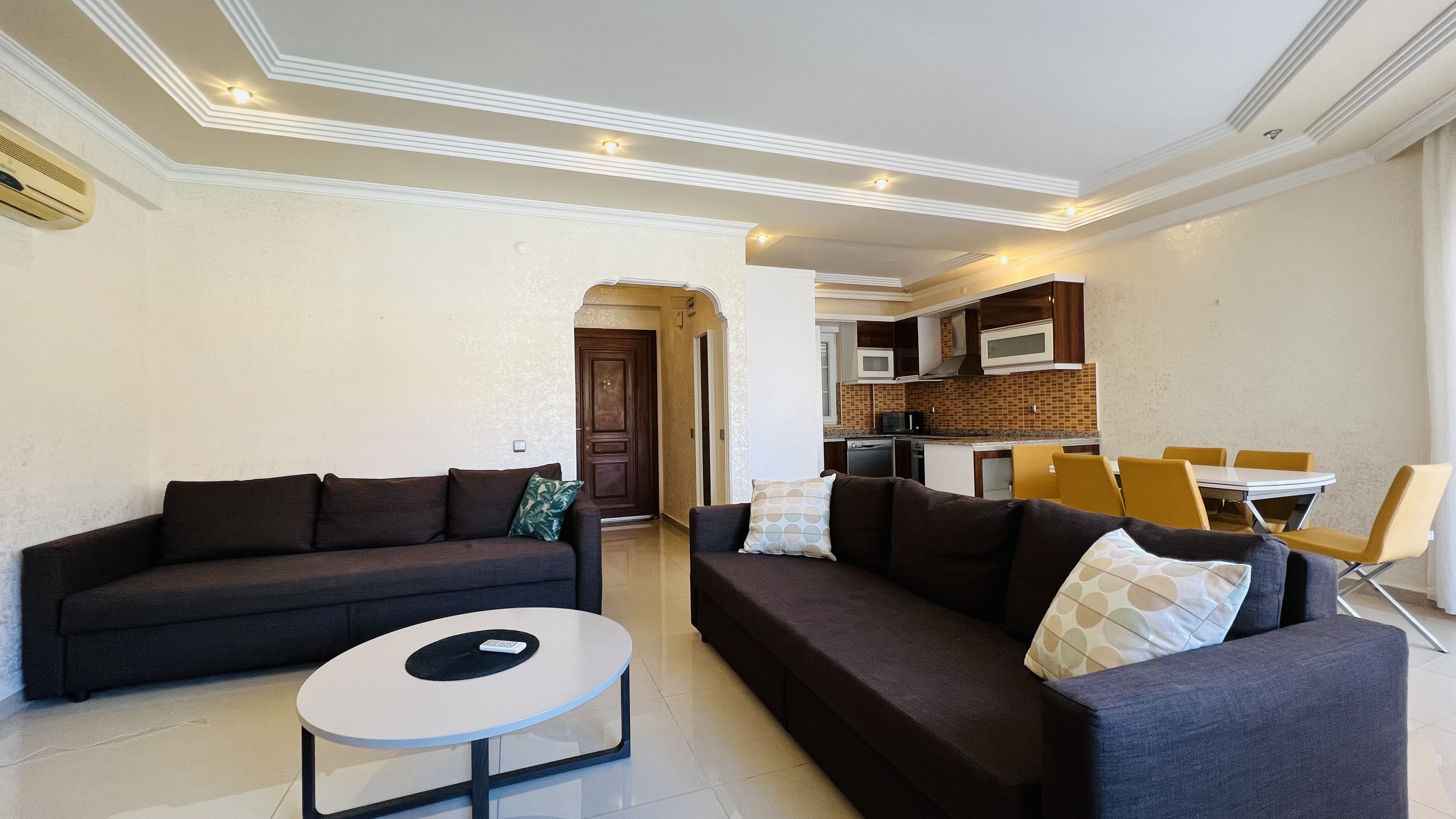 Расстояние до моря составляет около 600 метров, до ближайшего супермаркета — всего 100 метров, а международный аэропорт Антальи находится примерно в 60 км.