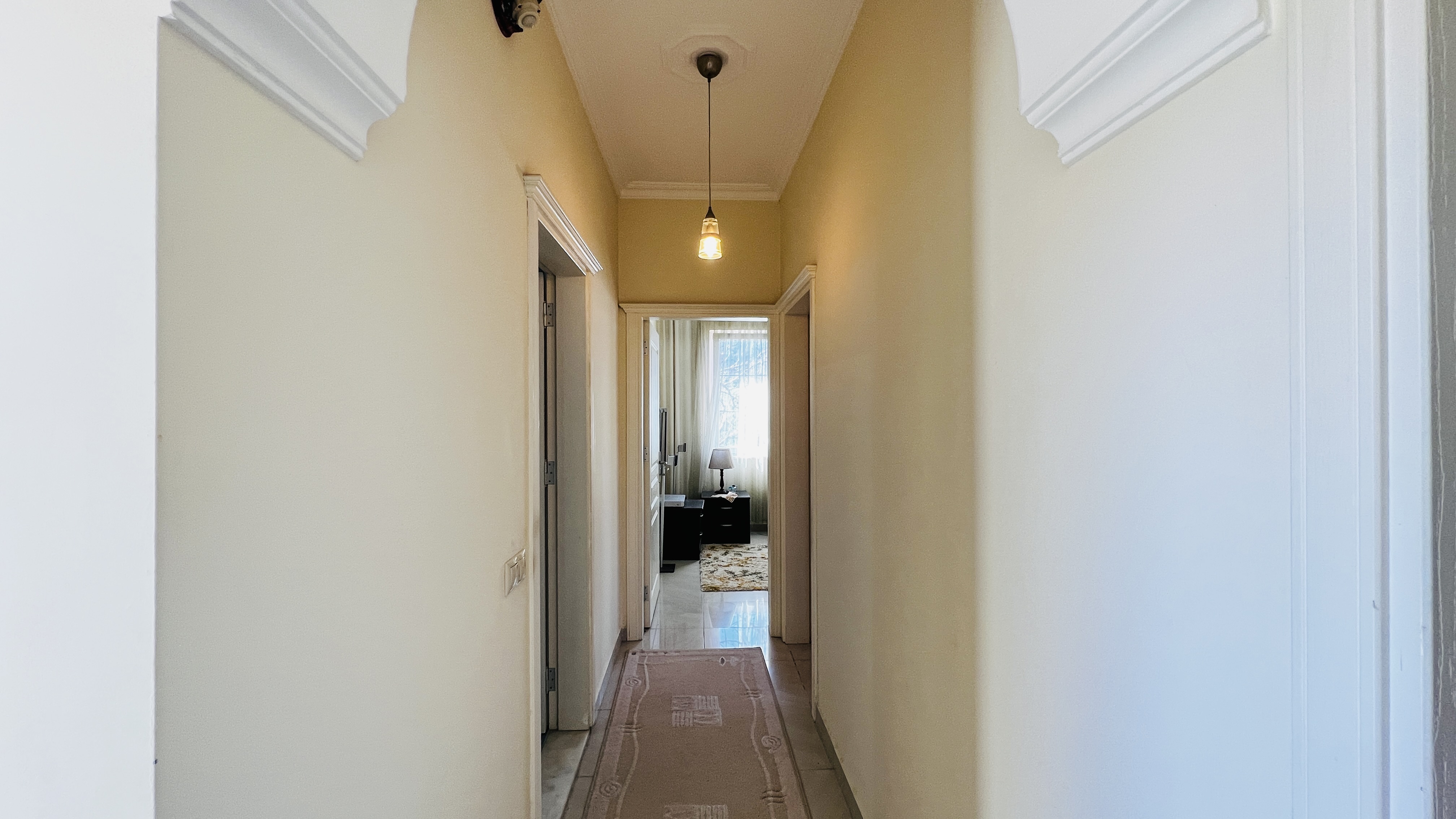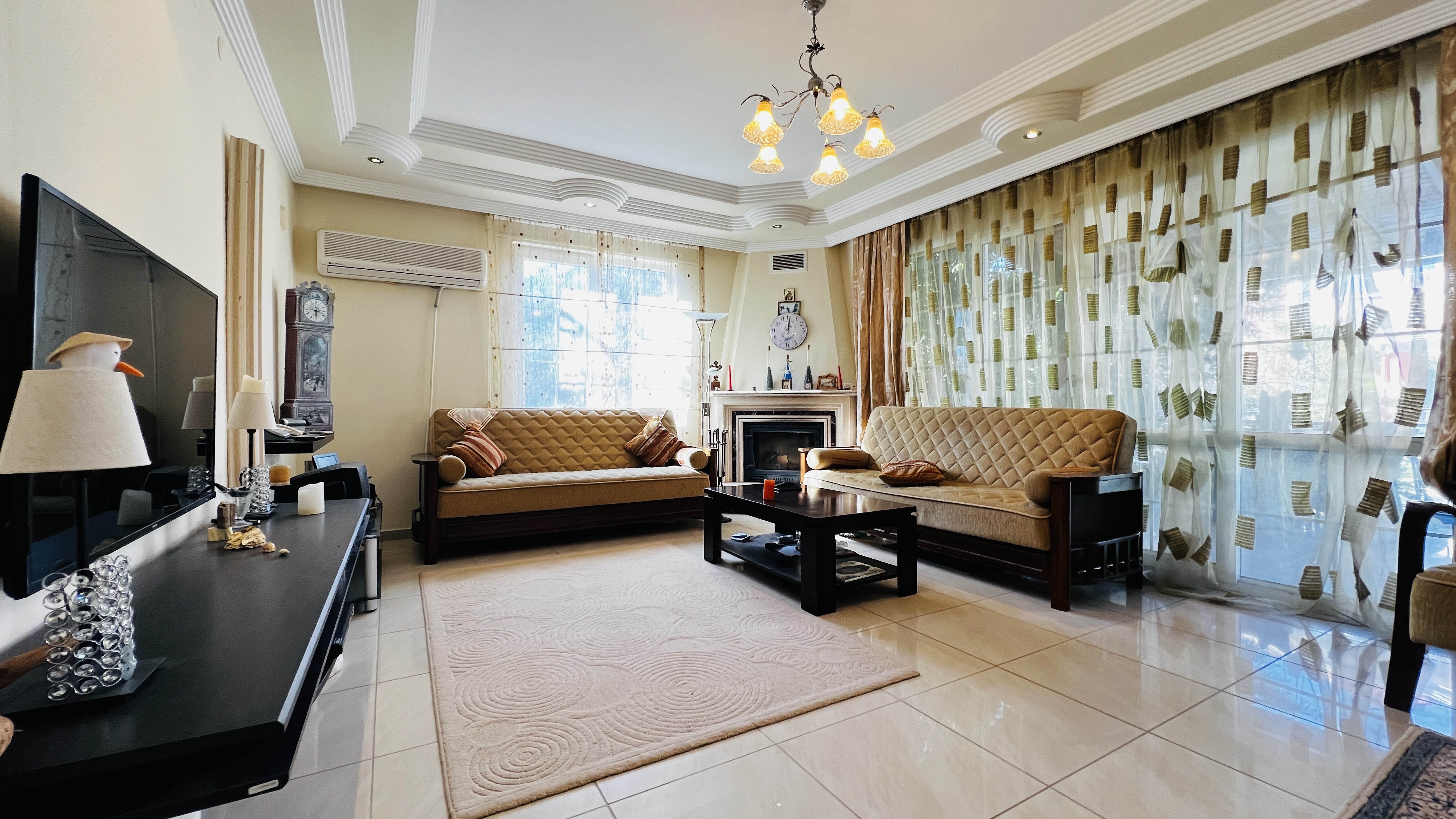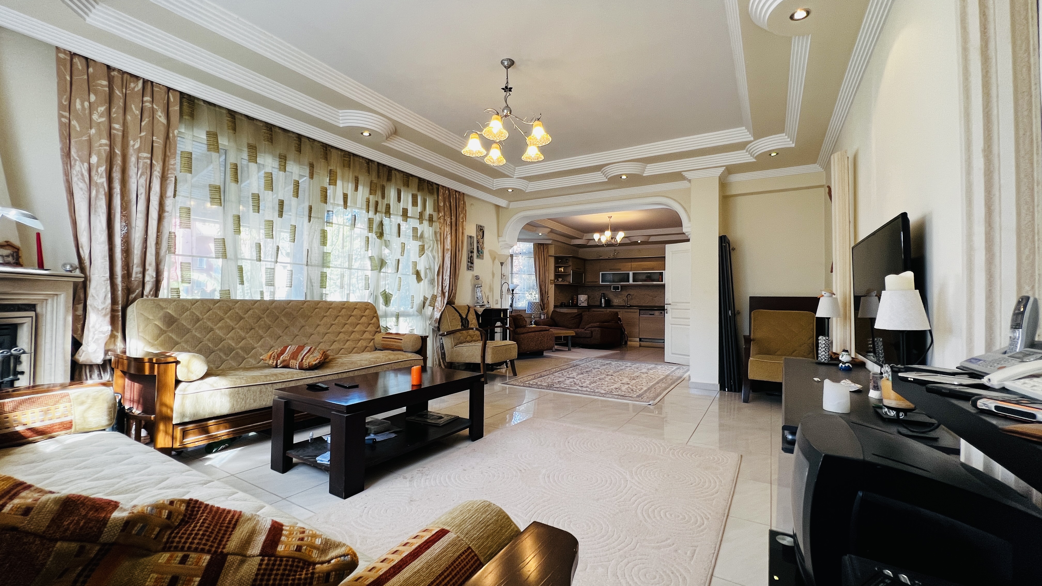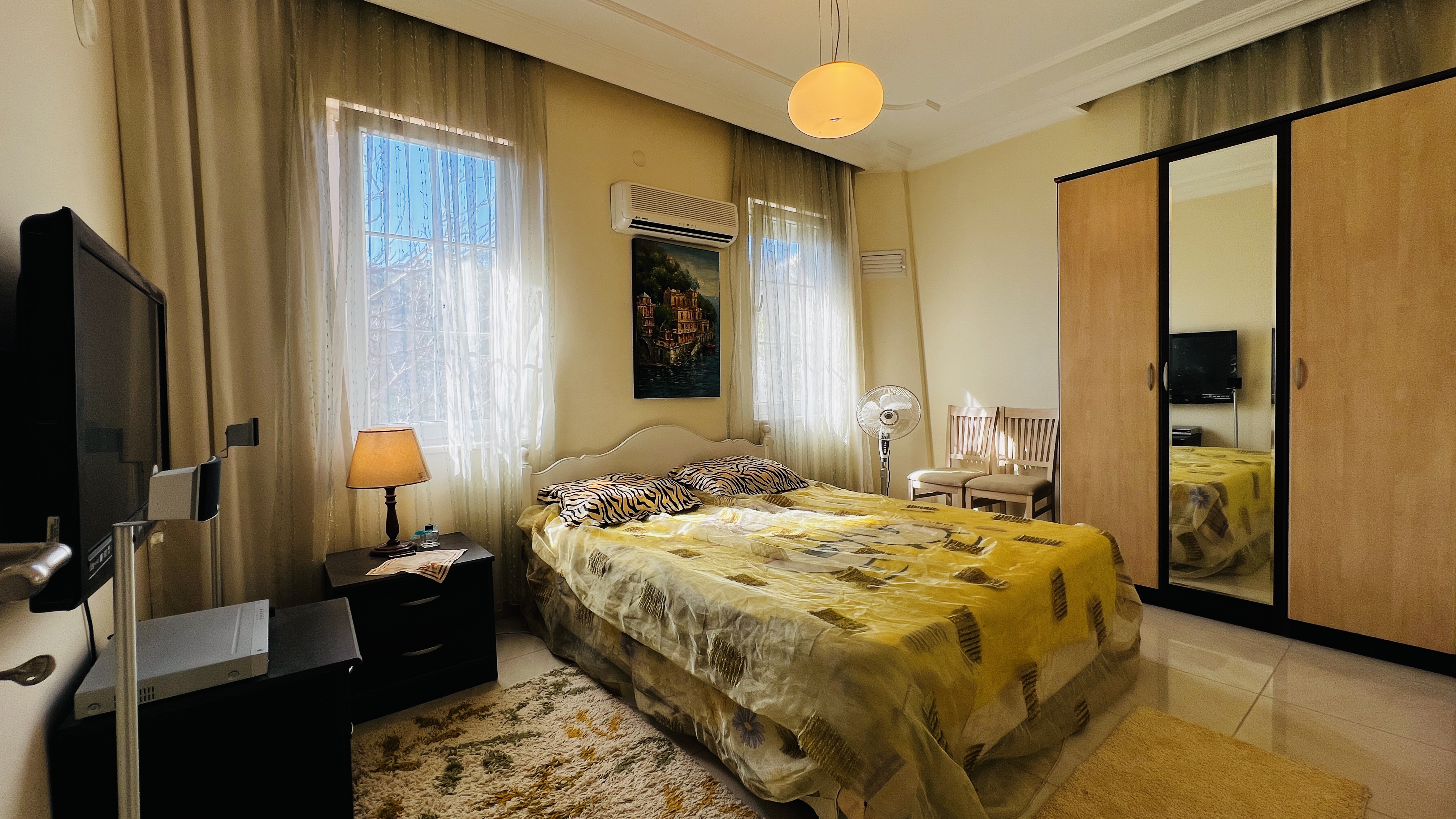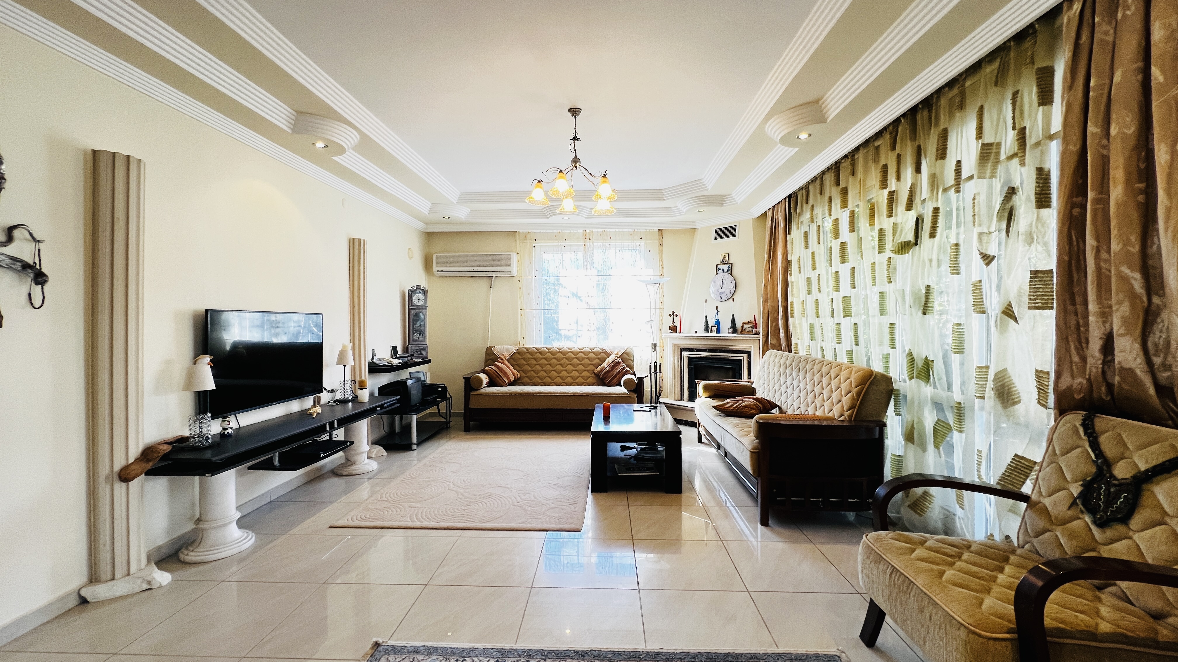 На первом этаже расположена просторная гостиная с кухней открытого плана, гостевой санузел и терраса с выходом на территорию комплекса. Второй этаж включает три спальные комнаты, одна из которых имеет собственную ванную комнату, а также общую ванную, кладовую и два балкона. Из дома открываются красивые виды на горы Торос и вершину Тахталы, которые особенно впечатляют в зимнее время.