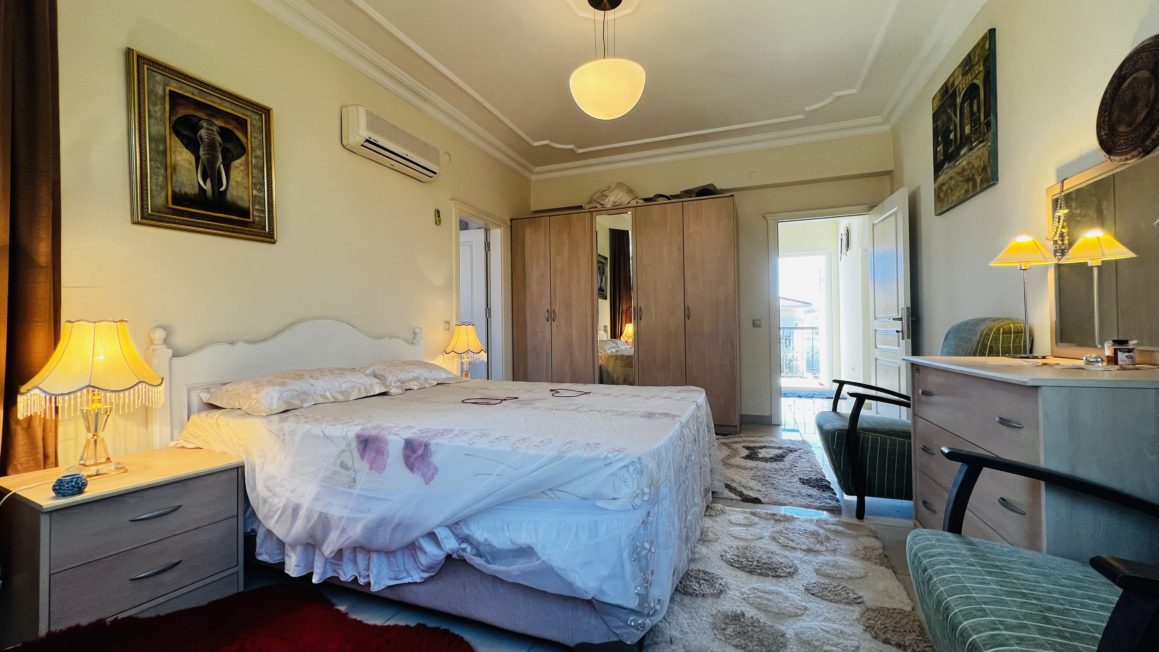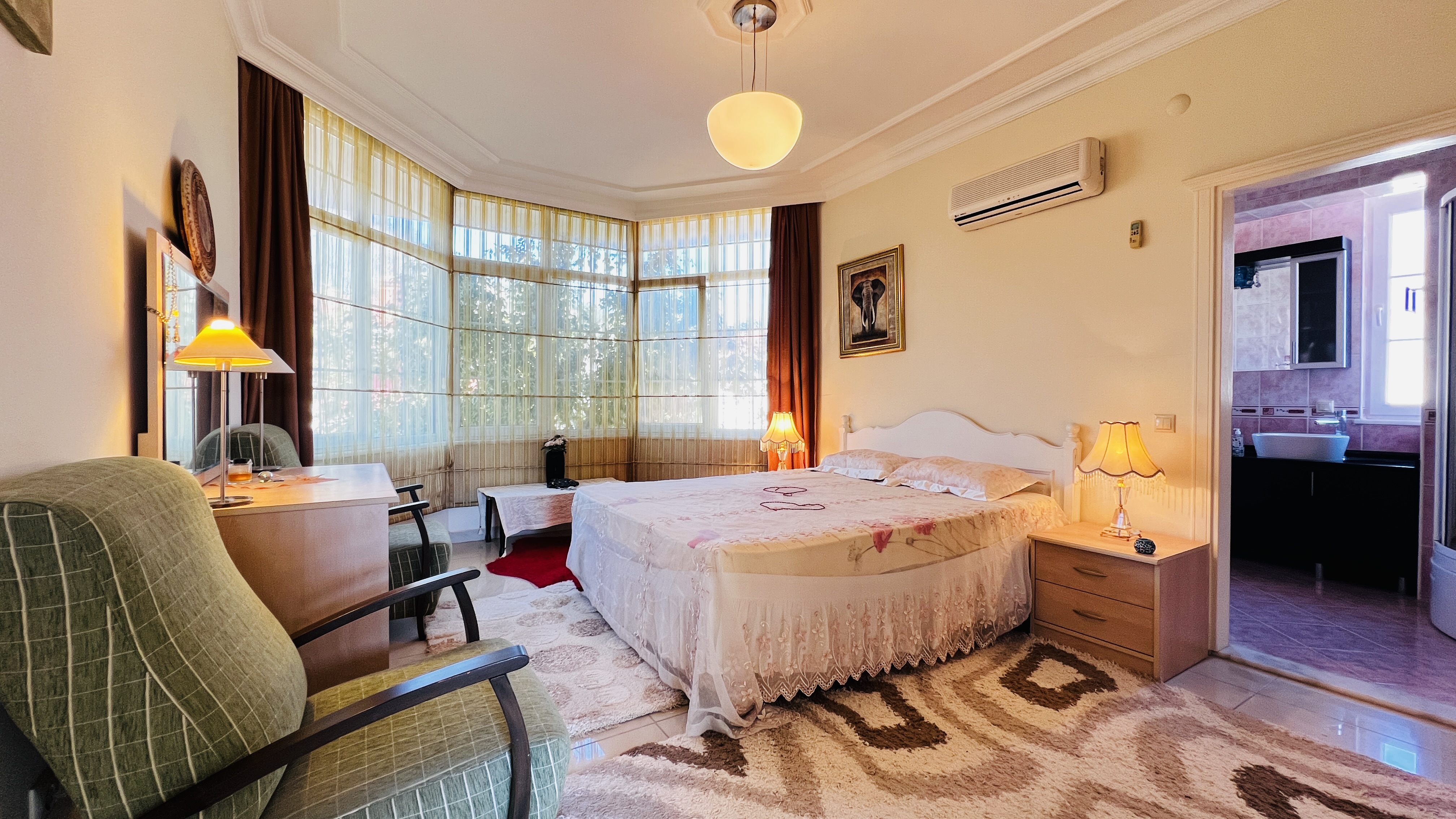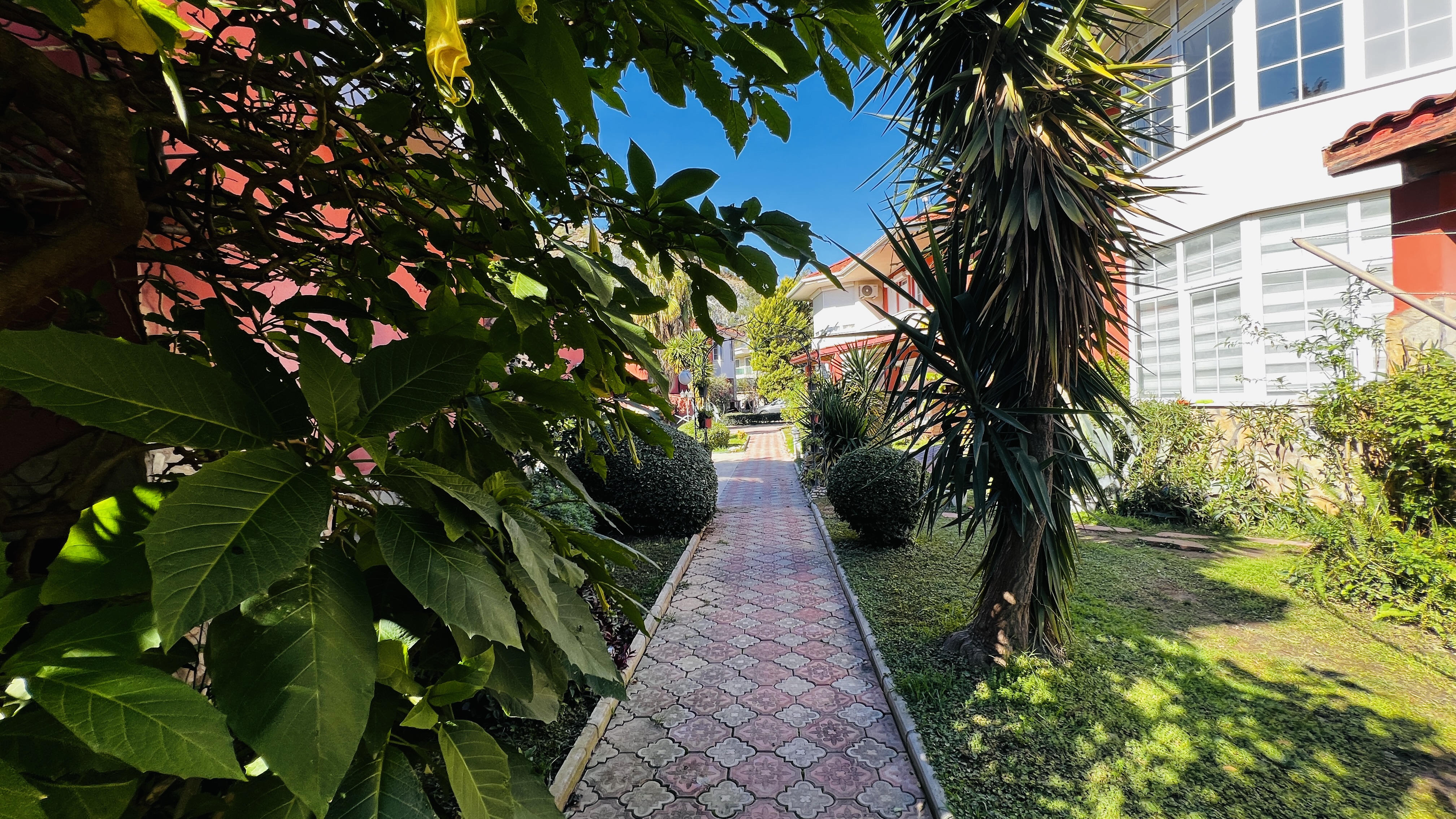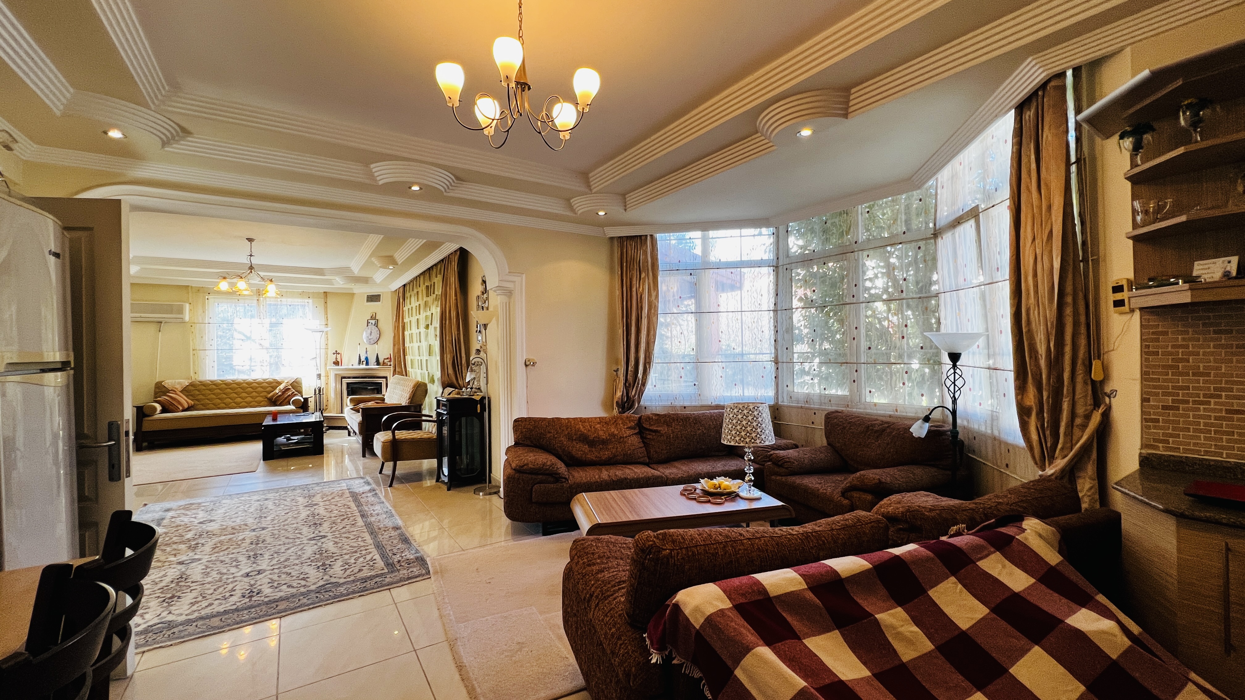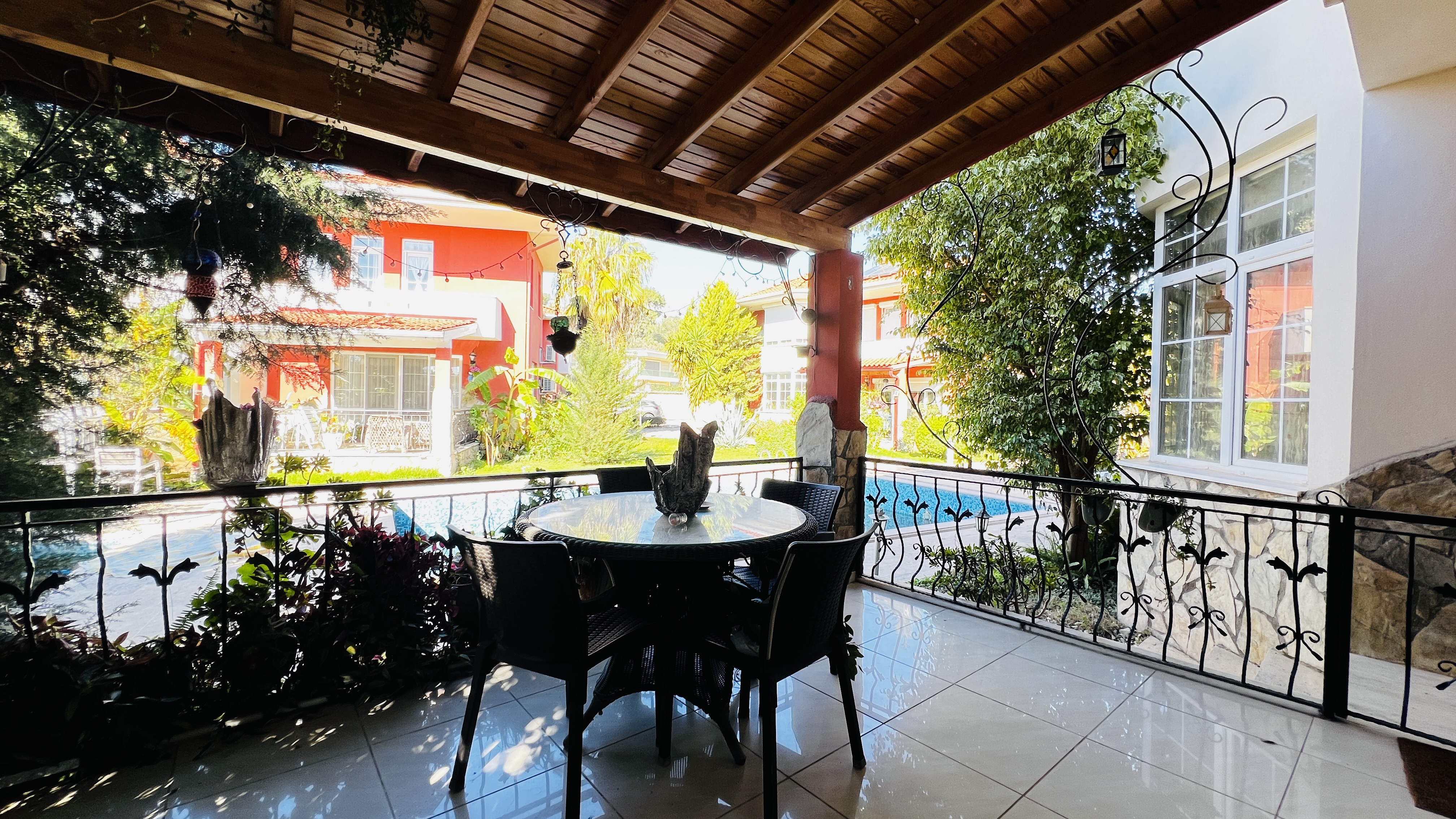 На первом этаже расположена просторная гостиная с кухней открытого плана, гостевой санузел и терраса с выходом на территорию комплекса. Второй этаж включает три спальные комнаты, одна из которых имеет собственную ванную комнату, а также общую ванную, кладовую и два балкона. Из дома открываются красивые виды на горы Торос и вершину Тахталы, которые особенно впечатляют в зимнее время.