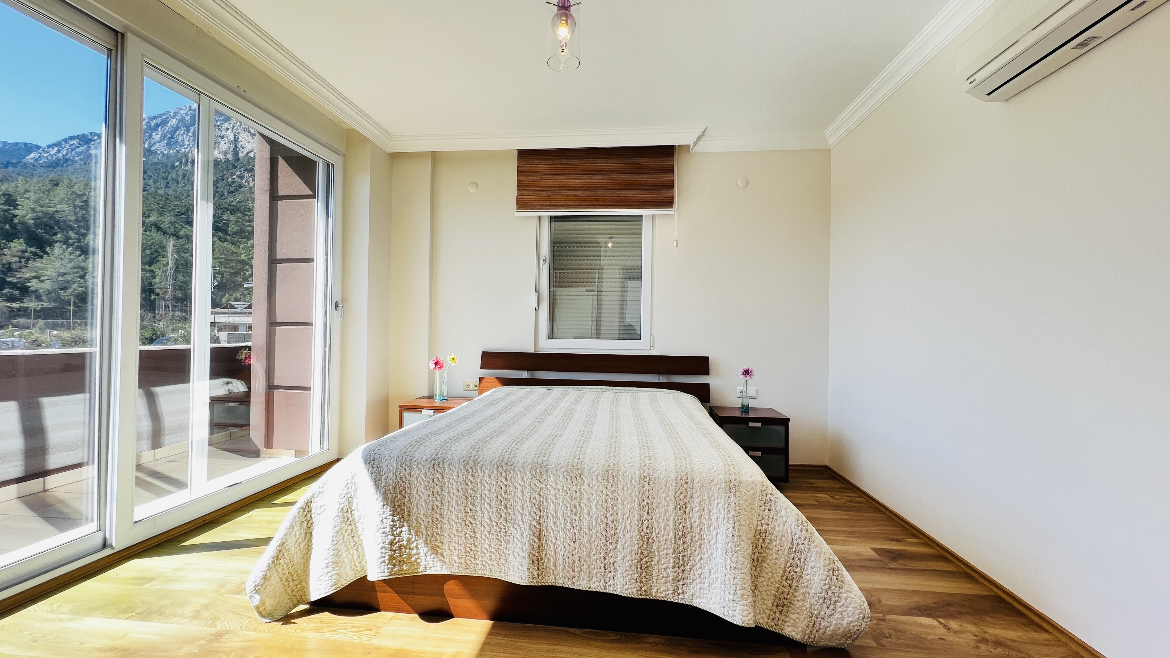 Большие окна позволяют наслаждаться великолепным видом на горы прямо изнутри дома, создавая естественную атмосферу.